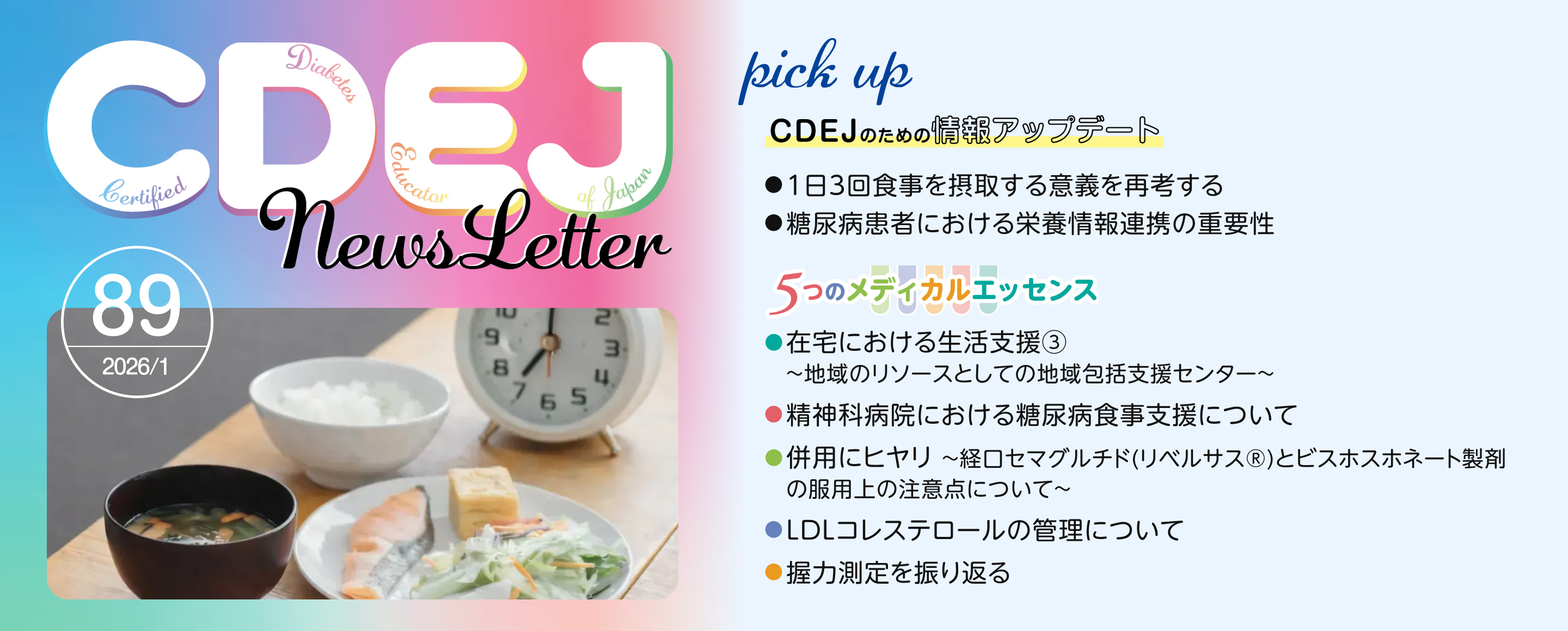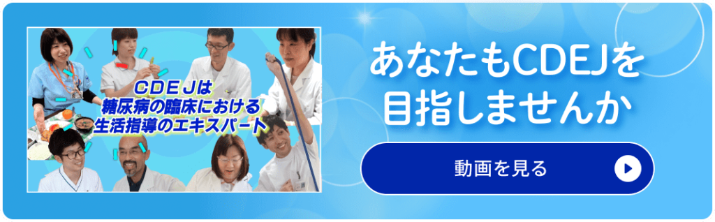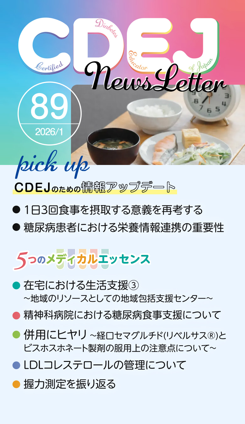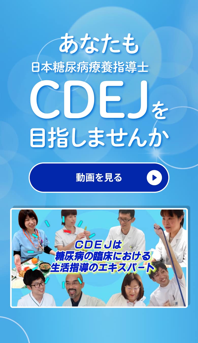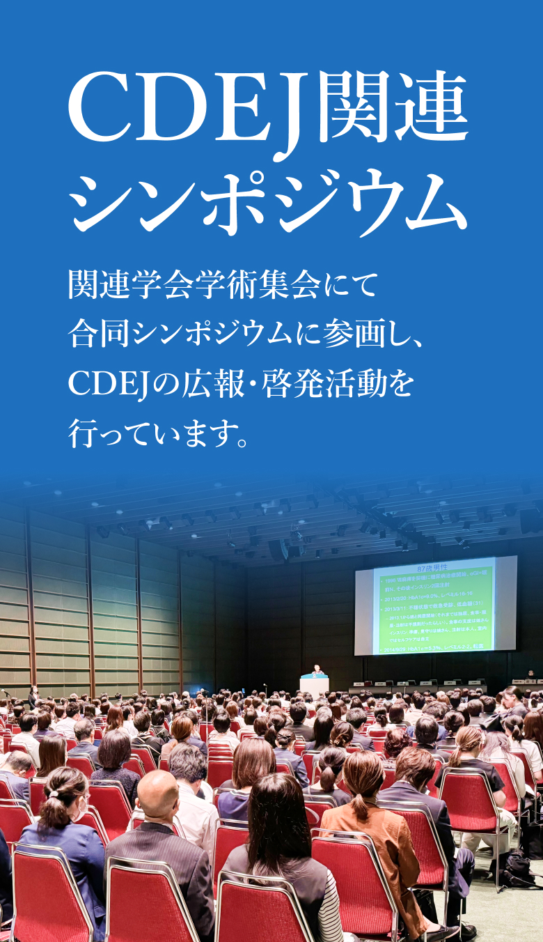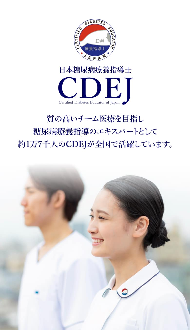 『CDEJ News Letter』はCDEJの方向けの情報誌です。ログインしてご覧ください。 第89号 【理事長巻頭言】 ●2026年の年頭にあたって 【CDEJのための情報アップデート】 ●1日3回食事を摂取する意義を再考する●糖尿病患者における栄養情報連携の重要性 【5つのメディカルエッセンス】 ●在宅における生活支援③~地域のリソースとしての地域包括支援センター~●精神科病院における糖尿病食事支援について●併用にヒヤリ~経口セマグルチド(リベルサス®)とビスホスホネート製剤の服用上の注意点について~●LDLコレステロールの管理について●握力測定を振り返る Topics 一覧へ 「第11回JSPTDM(日本糖尿病理学療法学会)学術大会」2025年12月20日~21日開催 「第13回日本くすりと糖尿病学会学術集会」2025年11月2日~3日開催 「2025年度(第18回)鈴木万平糖尿病国内賞表彰式」2025年10月17日開催 2026年02月24日 CDEJ関連シンポジウムについて 2026年02月02日 住所およびURL変更のお知らせ 2026年01月22日 「第29回日本病態栄養学会年次学術集会」にてブースを設置します 2025年12月24日 「第26回認定試験(2025年度)」受験資格審査結果について 2025年12月12日 「第11回日本糖尿病理学療法学会学術大会」合同企画シンポジウム開催&ブース設置します 一覧へ Tweets by CDEJninteikikou CDEJは多職種がお互いにその専門性を発揮し、協力し合い、知恵を共有しています。 CDEJは豊富な知恵を糧に患者や家族が、自らの力で問題を解決しようとする本来の力に寄り添い、お手伝い出来ることについて、誇りに思っています。 CDEJはいつも自然体を心掛け、糖尿病患者に寄り添い、患者の話を心でも聞いています。 CDEJは糖尿病医療のあらゆる領域で、リーダーシップを発揮できるよう、患者の思い、悩みに耳を傾けています。 CDEJについてもっと知る CDEJ・医師・患者さんの声 患者さんからの体験談や資格を取得してからの CDEJの体験談をご紹介いたします。 CDEJ・医師・患者さんの声 糖尿病療養指導ガイドブック2025 CDEJを目指す方へCDEJパンフレット CDEJ認定機構20周年記念誌